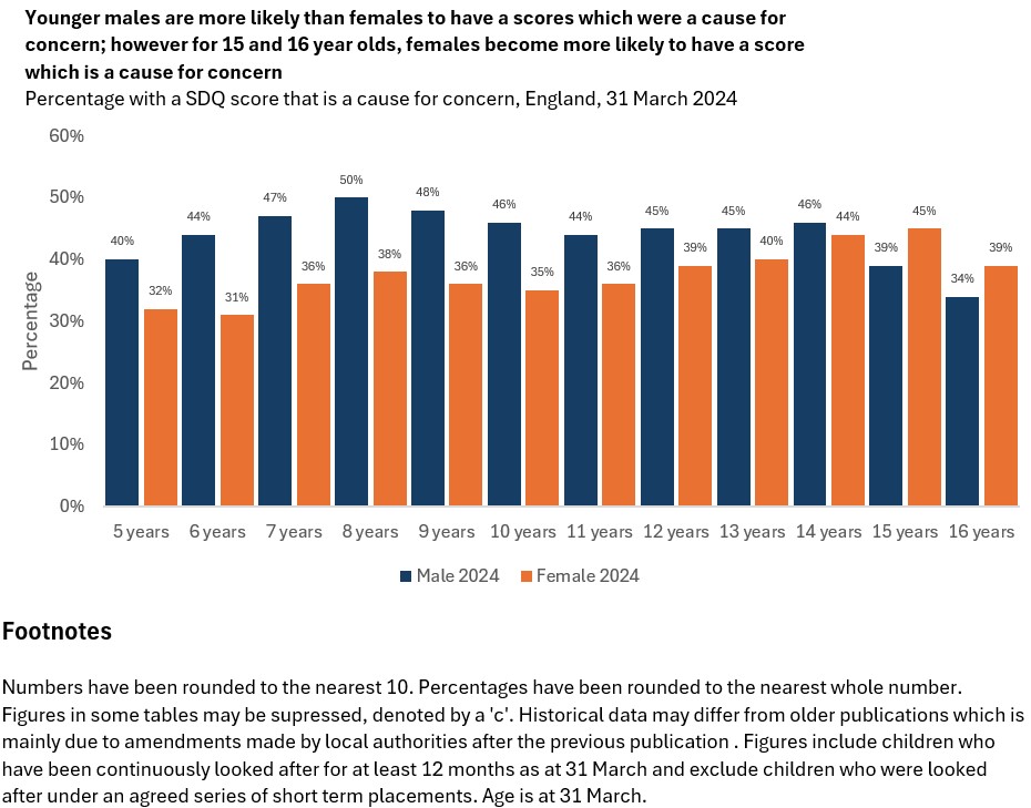 Males are slightly over-represented in the CLA population (57%) compared to the overall child population (51%) - as shown in the latest ONS mid-year population estimates (opens in new tab). Some of this is due to UASC, however males are still slightly over-represented for non-UASC CLA (53%).