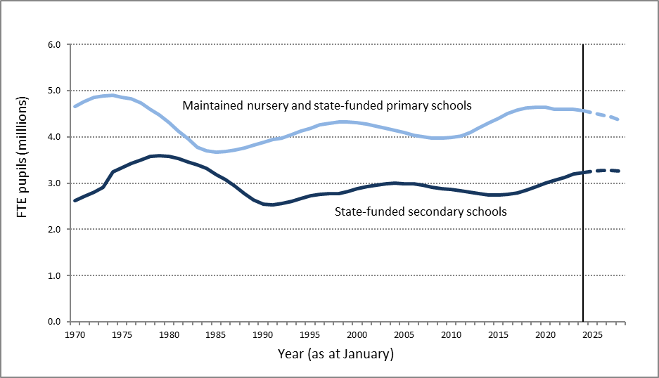 - The projection model previously published in 2023 estimated a state-funded school population of 7,519,000 in 2028, so the current projection, while still showing a decline, has an estimated 260,000 more pupils than the previous projection for 2028. The trend is unchanged between the two models.