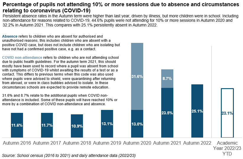 23.1% represents a fall from 25.1% in Autumn term. The high persistent absence rates are driven by illness towards the end of the Autumn term. UK Health Security Authority data (opens in new tab) shows that a number of illnesses all peaked at around the same time in December. Typically, illnesses are more spread across the season. Between the end of November and the end of December 2022, persistent absence increased from 21.7% to 25.1%. In Autumn 2022, 13.2% of pupils were persistently absent solely due to illness, a large increase on 5% in Autumn 2019.