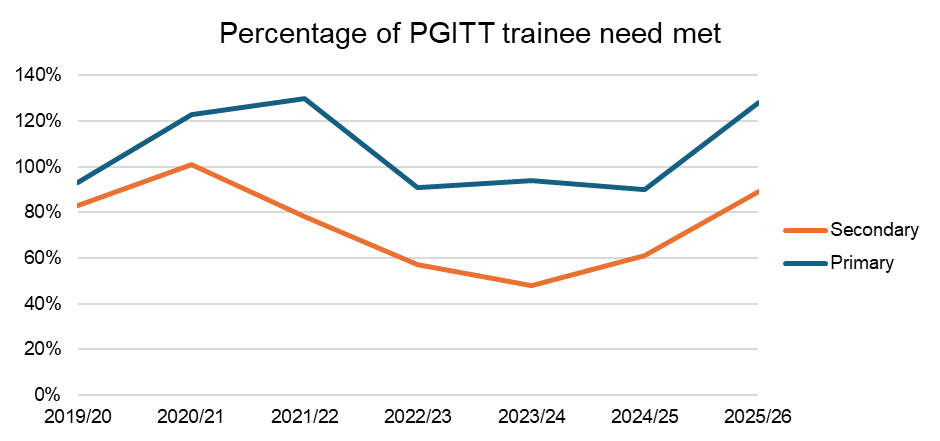 It has been particularly challenging to meet secondary PGITT recruitment need in recent years due to rising pupil numbers which have increased the demand for teachers. Excluding the pandemic, recruitment need has not been met since 2012/13, but there has been year-on-year improvement of secondary PGITT recruitment from 48% of PGITT need in 2023/24 to 61% in 2024/25 to a provisional performance against PGITT need of 89% in 2025/26.