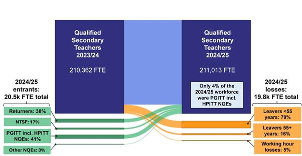As a consequence, the teacher workforce may grow year-on-year, even if PGITT recruitment is lower than PGITT trainee need. For example, during the covid-19 pandemic qualified secondary teacher numbers grew by 12,000 (between 2019/20 and 2022/23), despite PGITT recruitment not meeting PGITT trainee need in most years over this period. This growth was largely due to leaver rates being much lower than originally expected.