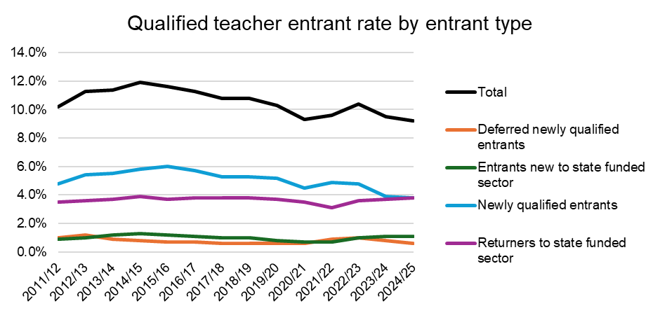 Both the number of returners (those teachers returning to the state-funded school sector in England) and those who are new to the sector (including newly trained teachers who do not join the workforce immediately after ITT) are estimated using forecasts that consider the latest workforce and economic data as of December 2025.