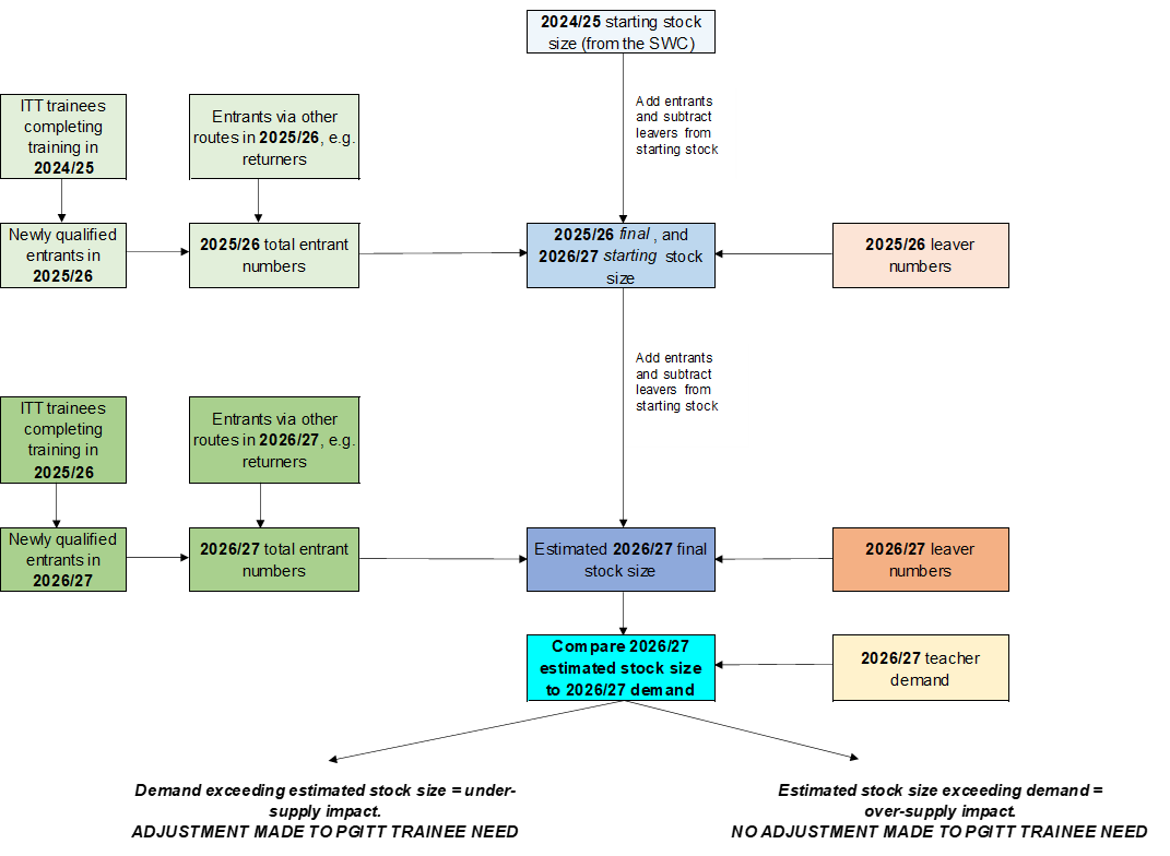 The teacher workforce model (TWM) is a national, stocks and flows model covering all state-funded primary and secondary schools, academies, and free schools in England [4]. The model estimates the number of qualified teachers required for both primary and each secondary subject; and by considering the number of teachers that will leave or enter service in future, estimates the 2026/27 PGITT trainee need needed to supply sufficient numbers of teachers in 2027/28.