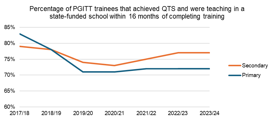 Post-ITT employment rates are published for trainees within the initial teacher training performance profiles publication (published in July 2025). The rates reflect the proportion of those completing PGITT that gain employment within the state-funded schools sector within 16 months of completing training.