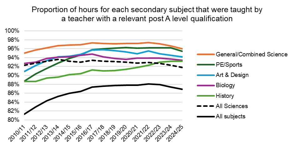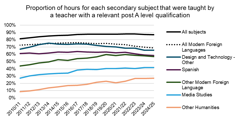 This fall has been driven by more favourable supply forecasts this year. In particular, there have been recent boosts to ITT recruitment (including an increase of 3,600 secondary ITT trainees between 2023/24 and 2025/26) that is expected to deliver greater numbers of newly qualified teachers in the future.