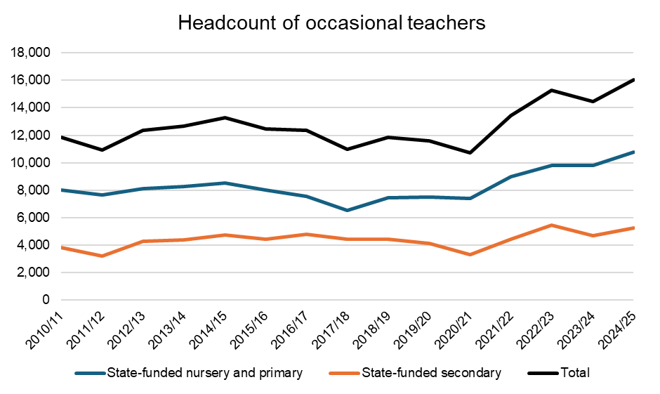 Occasional teachers are those that are not directly employed by the school or local authority but who are in school on census day (early November each year) with a contract or service agreement lasting fewer than 28 days. The number of occasional teachers have risen substantially since 2020/21 (with a small decrease in 2023/24 compared to 2022/23). In November 2024, schools reported 16,000 occasional teachers (headcount) in state-funded nursery, primary, and secondary schools on census day. This is an increase on the previous year when 14,500 were reported.