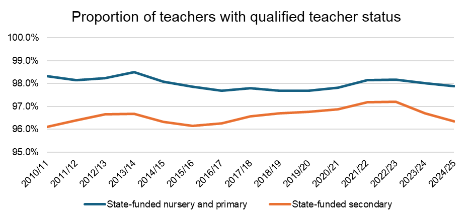 The proportion of teachers in service that hold qualified teacher status (QTS) has remained consistently higher than 96% since 2010/11 when the school workforce census began.