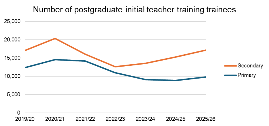 There are promising signs in recruitment. The latest PGITT data (from the ITT Census publication published in December 2025) shows that there were 9,815 entrants to postgraduate primary ITT in 2025/26, an 11% increase from 8,853 in 2024/25. For secondary, there was a 13% increase, from 15,255 in 2024/25 to 17,174 in 2025/26, with falls only seen for Classics and English. These figures include those recruited to high potential ITT (HPITT) and self-funded trainees (see more details in the ITT census publication methodology) and have been sourced from the ITT census publication.