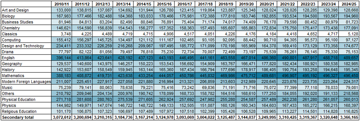 - Unlike last year, no under-supply adjustment was necessary this year for Mathematics, Physics, Computing, Modern Foreign Languages, Geography, Art and Design, Design and Technology, Music, and Religious Education.