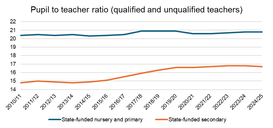 Both pupil and teacher numbers have varied throughout recent years, however the pupil to teacher ratios for both primary and secondary state-funded schools have remained relatively stable over the last 5 years as schools have adapted to changes in pupil demographics. A key driver of strong teacher supply is PGITT recruitment that has seen an increase in the 2025/26 academic year compared to 2024/25 for both primary and secondary.