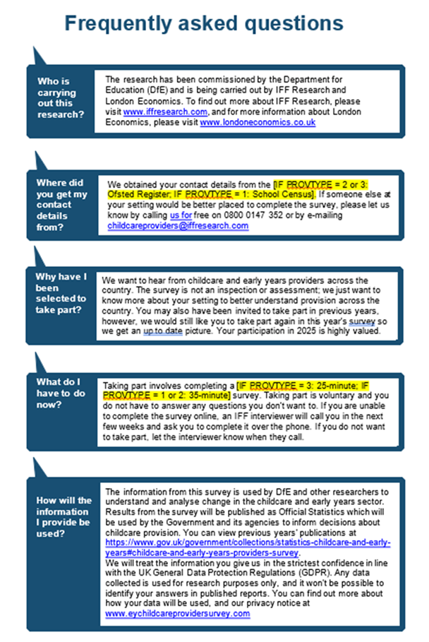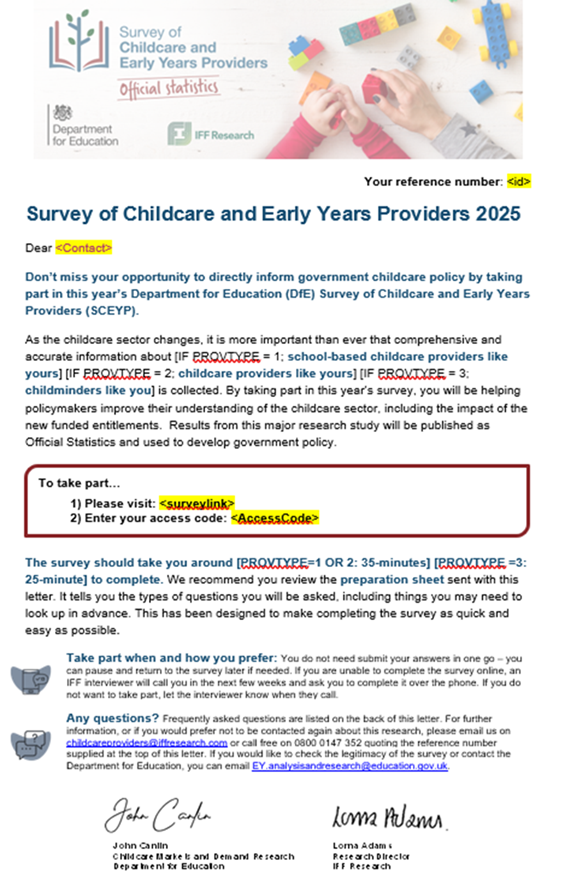- In 2025, a ‘short’ version of the survey (asking providers about the fees that they charged to parents and funding rates they received from their local authorities) was dropped and all providers were sent the bigger, ‘main’ survey, in order to maximise the number of responses that this received.