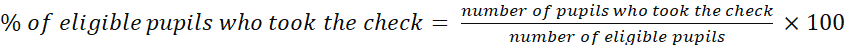 These pupils are counted as eligible pupils as it assumed that most of these pupils did not take the check because they were working below the level of the assessment, absent, unable to access or just arrived and the school did not comply with the requirement to submit a reason. It is possible a small proportion of these pupils had left the school or were incorrectly registered and therefore would not have been counted as an eligible pupil if a reason had been provided.
