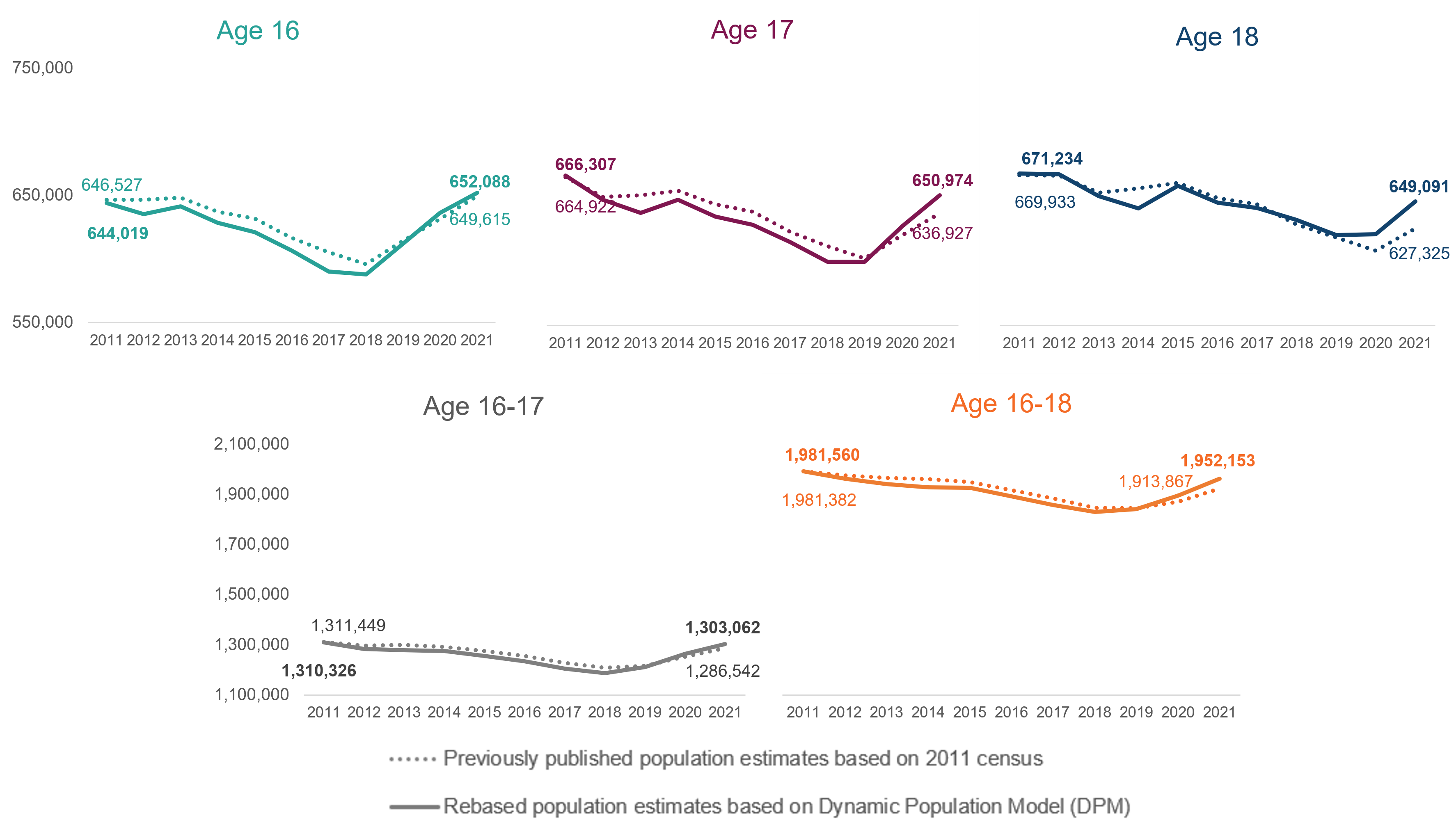 Charts showing the revised population estimates from 2021 by age compared with those previously published