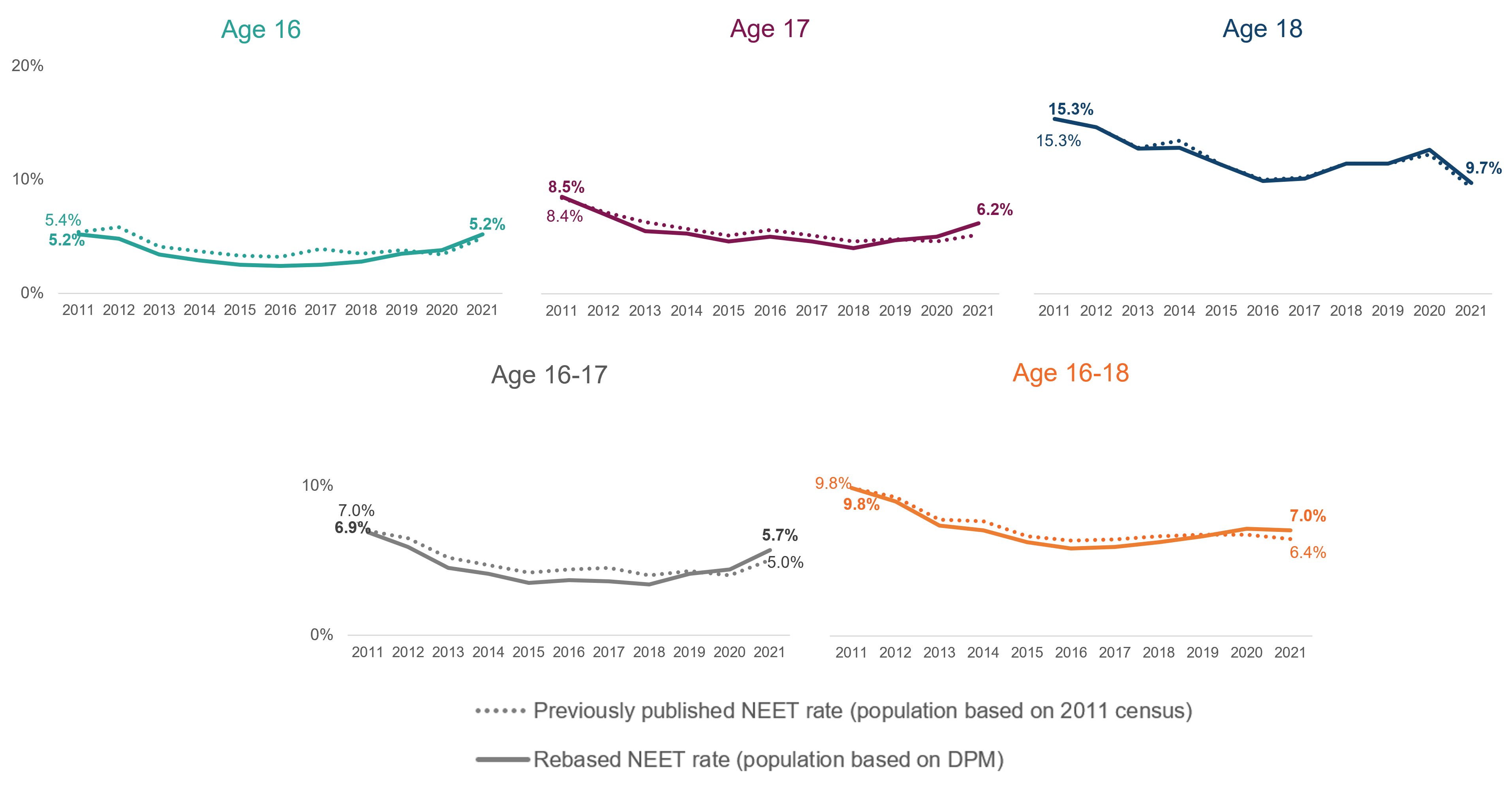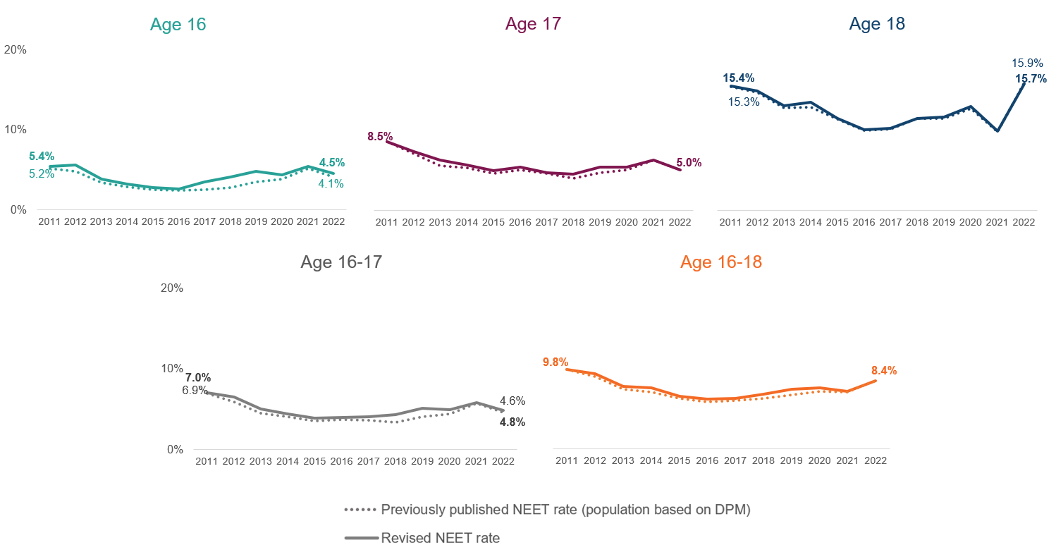- Following the 2011 census: The 2011 population estimate was revised using Census 2011 which led to the population estimate of 16 to 18 year olds increasing by 4 percent which in turn caused the NEET figure to increase by 1.8 percentage points.