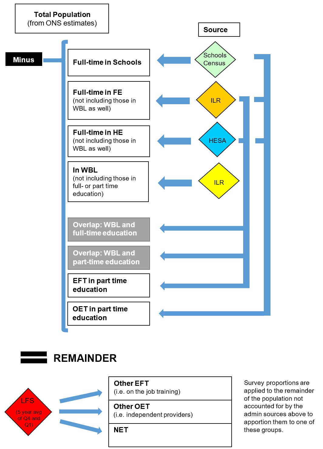 - non-college based OET (and not part time education that would be captured by the admin sources) i.e. independent training providers (‘Other OET’ in figure 1) and;