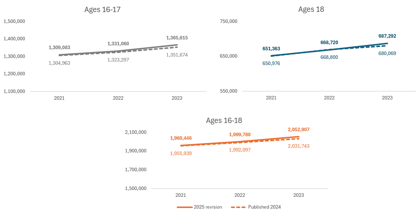 The latest population estimates used in the Participation in education, training and employment 16–18 statistics use ONS rebased mid-year estimates for 2023. For 2024 projections (published Jan 25) have been used which have taken account of migration up to June 2024 (published Nov 24). Further migration stats have since been made available covering the period to December 2024 but these have not been used in this release and may lead to some revisions in the future.