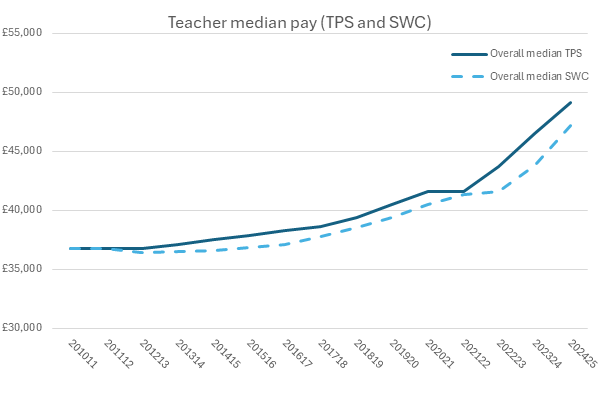 Where mean and median salaries have been provided this is based on the gross salaries for the cohort identified for example in that particular phase of education, grade, gender and age group and excluding those teachers where the salary was not recorded or is not credible. They exclude figures based on fewer than 3 identified salaries for the mean or 25 in the case of medians as recommended in Office for National Statistics, (ONS) guidelines. The mean salary is the sum total of all salaries in the cohort divided by the number of teachers. The median is the mid-point salary in the cohort when the salaries arranged in order from smallest to largest.